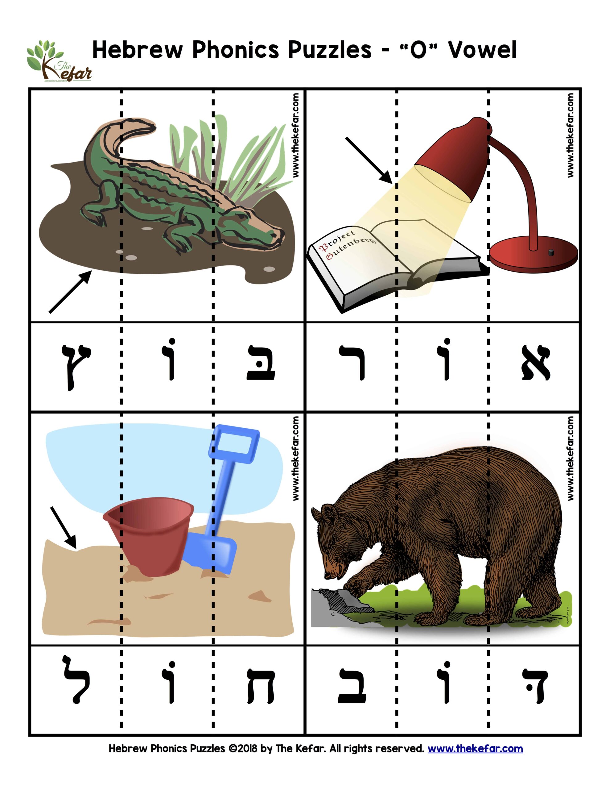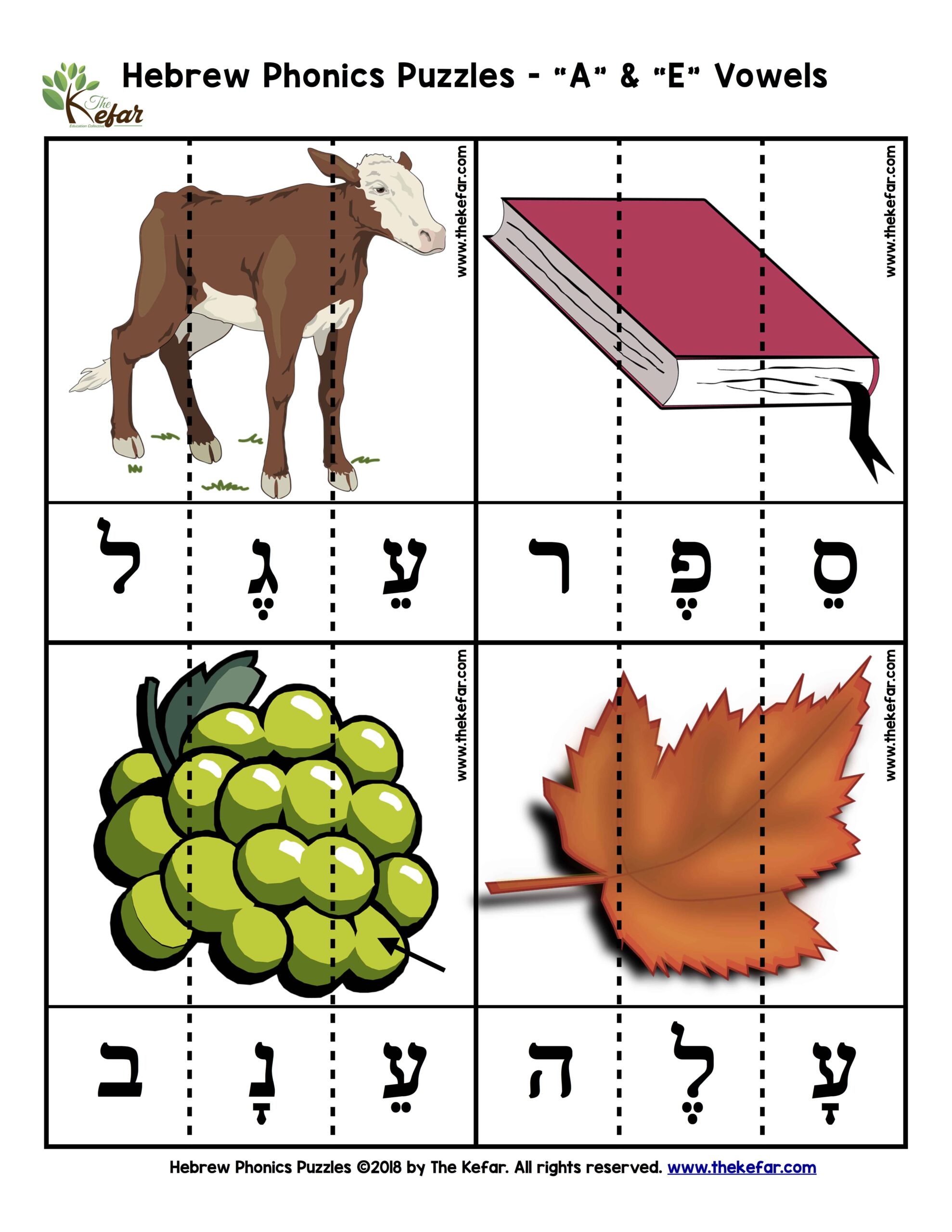 These Hebrew Phonics Puzzles are a fantastic tool for teaching Hebrew reading, spelling, and vocabulary. This bundle includes all six Hebrew Phonics Puzzle packets, covering the “A,” “E,” “I,” “O,” and “U” vowels. Each packet has 12-24 puzzles (there are 108 in all), a comprehensive educator’s guide that includes a quick & easy Hebrew reading tutorial + activity suggestions, and a pronunciation chart that lists each vocabulary word in Hebrew and English, along with its transliteration and pronunciation.