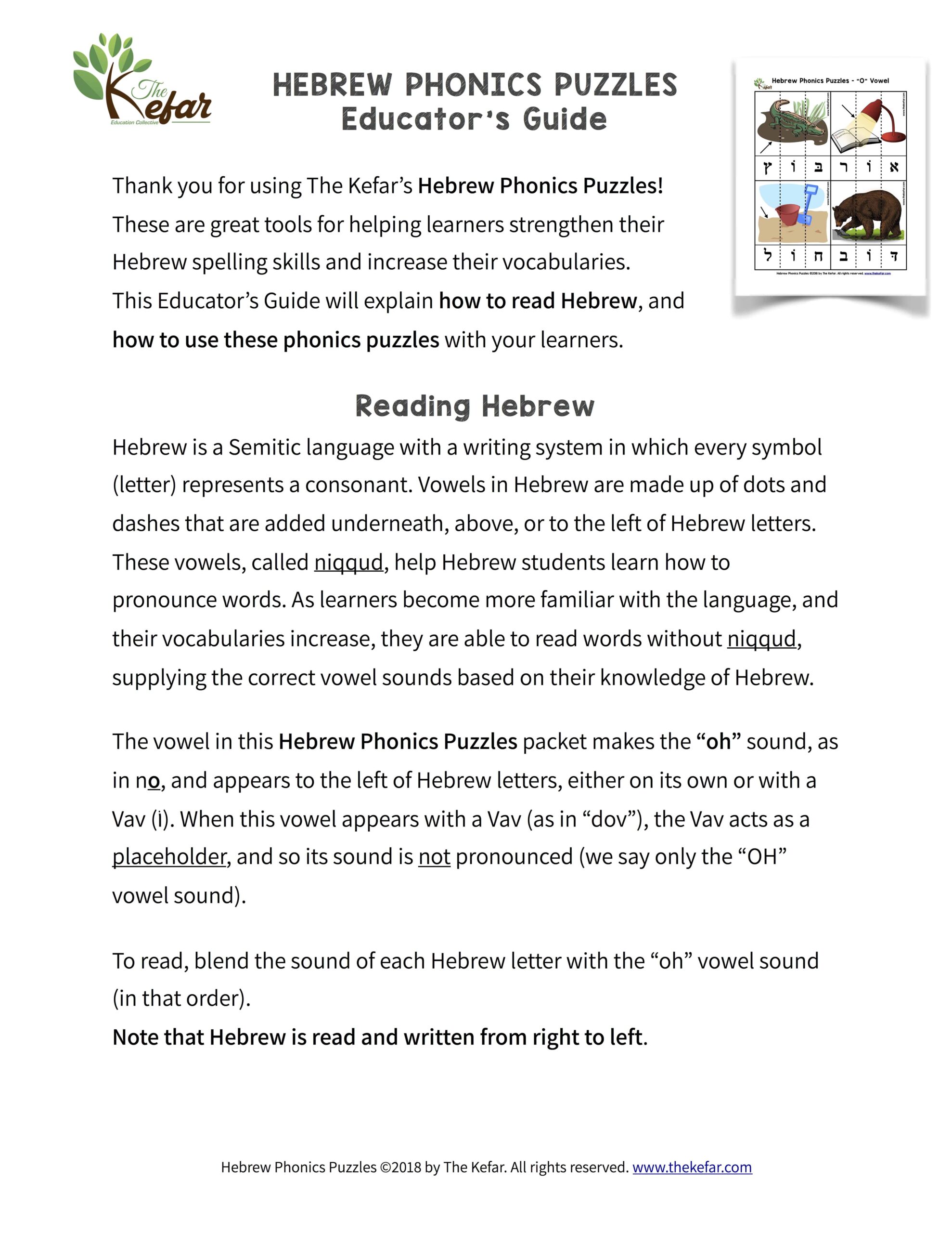 These Hebrew Phonics Puzzles are a fantastic tool for teaching Hebrew reading, spelling, and vocabulary. This packet covers the “O” vowel – cholam – and includes 12 puzzles, a comprehensive educator’s guide that includes a quick & easy Hebrew reading tutorial + activity suggestions, and a pronunciation chart that lists each vocabulary word in Hebrew and English, along with its transliteration and pronunciation.
